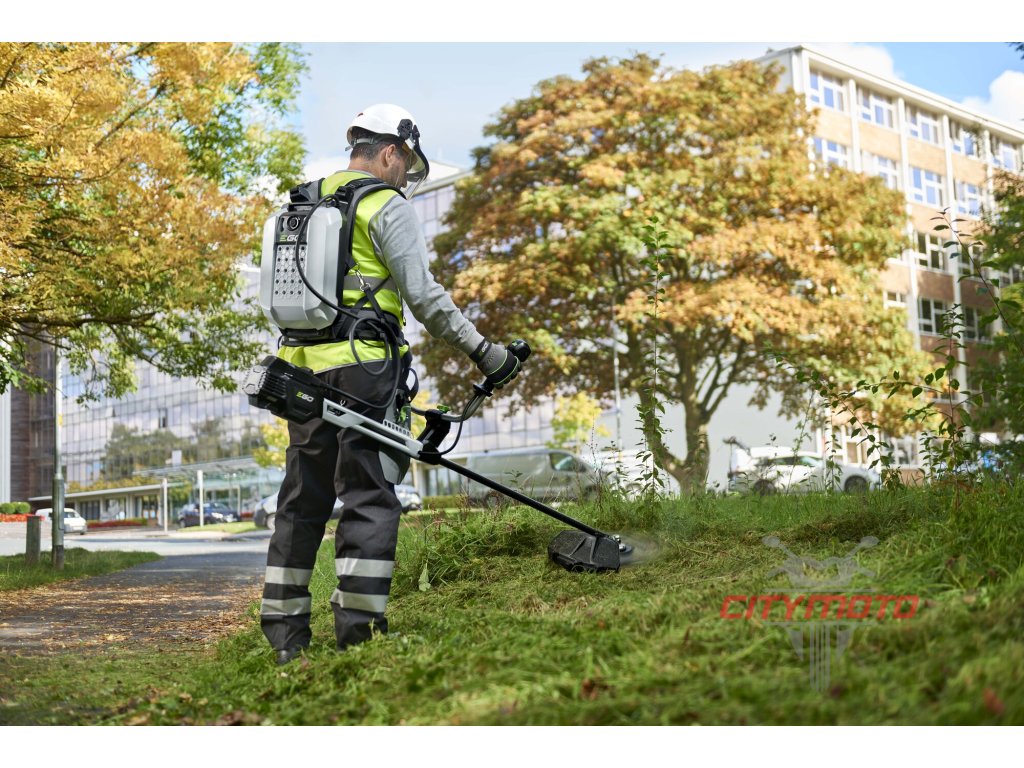 Díky ovládacím řidítkům je držení křovinořezu při práci velmi stabilní, bezpečné a pohodlné a stroj je vhodný i pro použití s ocelovým travním kotoučem. Nylonová žací struna o ∅ 2,4 - 3,0mm namotaná na cívce poloautomatické strunové hlavy se v případě potřeby automaticky prodlouží pouhým poklepem strunovou hlavou o zem. Když je zásoba struny na cívce spotřebována, její doplnění je velmi snadné. Dokonalá ochrana před odlétávající trávou je zajištěna díky rozměrnému a robustnímu bezpečnostnímu krytu. Křovinořez je dodáván samostatně bez nosného postroje, baterie a nabíječky! Napájení křovinořezu je prostřednictvím kabelové přípojky ze zádové profi velkokapacitní baterie EGO Power+ Professional X, 28Ah s postrojem BAX1501 doplněné o závěs křovinořezu AHP1500 nebo klasickou systémovou baterií EGO 56V nesenou zádovým nosičem baterie BH1001 doplněným o závěs křovinořezu AHP1300 nebo klasickou systémovou baterií nesenou profi zádovým nosičem baterie BHX1000-K0002 doplněným o závěs křovinořezu AHP1500 . Proto je nutné baterii, příslušný nosič baterie, závěs křovinořezu s bočním chráničem nohy a nabíječku dokoupit zvlášť. Při použití zádové profi velkokapacitní baterie EGO Power+ Professional X, 28Ah vám bude křovinořez pracovat s ocelovým kotoučem nepřetržitě až 7 hodin. Výkonný a účinný bezuhlíkový motor je zavěšen v horní části nosného tubusu, vyrobeného z karbonových vláken. Tubus je tak mnohem lehčí, odolnější a pevnější než běžné hliníkové. Navíc při zatížení a prohnutí se bez problémů vrátí do původní polohy. U hliníkových tubusů hrozí nebezpečí nevratného ohnutí a je nutná výměna. Díky eleasticitě a houževnatosti karbonu tubus absorbuje velkou část vibrací od pracovního nástroje a nepřenáší na řidítka a ruce uživatele. Stroj je vhodné pro dokončovací práce při likvidaci travního porostu jak kolem zídek, plotů, stromů, keřů a jiných překážek, tak i na rozlehlejších plochách s nálety a křovinami. Stroj je mimořádně tichý a vhodný proto na použití v obydlené zástavbě, areálech nemocnic, škol a vůbec všech míst, která jsou citlivá na hlučnost a zápach. Díky nízké hmotnosti, zavěšené na dvojitém profesionálním ramenním postroji a dokonalému vyvážení stroje nepocítíte únavu ani po celodenní práci.