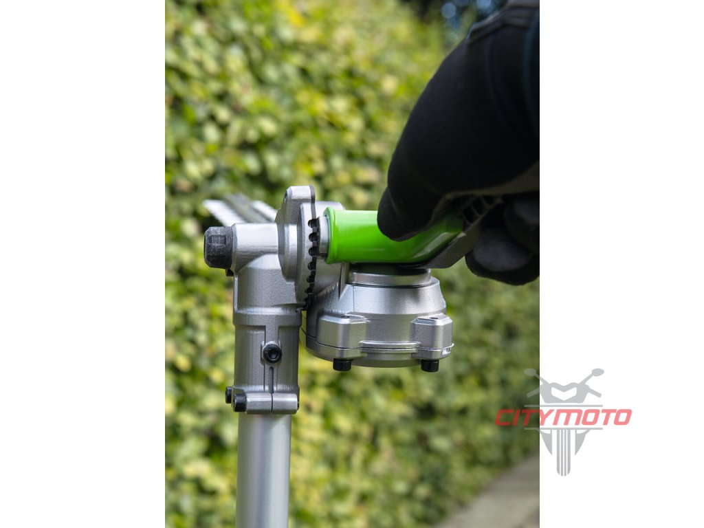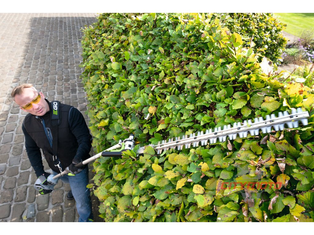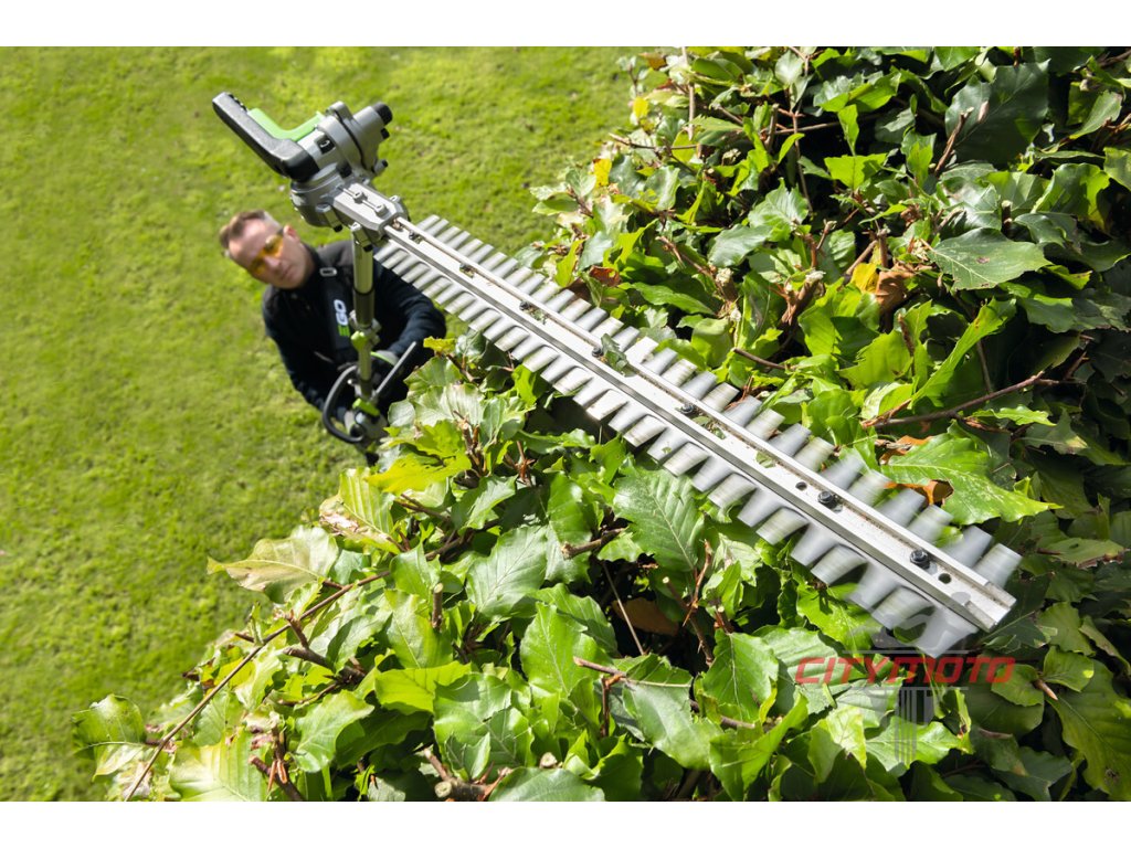 Pro kvalitní úpravu a precizní tvarování vysokých živých plotů a okrasných dřevin v okrasných zahradách, zámeckých parcích ale i doma na zahradě je důležitý čistý a přený střih, kterým rostlinu nepoškodíte, nezraníte a rostlina tak po zastřižení zůstává zdravá a svěží. To lze provádět v bezpečí stabilního postoje na pevné zemi. Proto je zde k dispozici nástavec s nůžkami na živý plot s dlouhým nástavcem a přesnou, 51cm dlouhou oboustrannou lištou, přesně broušenou pomocí diamantového nástroje. Pohodlné manipululaci při práci přispívá rovněž otočný kloub lišty. Úhel sklonu lišty do 12 různých poloh je velmi důležitý, aby se přizpůsobil příslušné práci na konkrétním porostu a usnadnil také uskladnění v malých prostorách. Mimořádně ostré střižné zuby mají rozteč 26mm jsou schopny ustřihnout dřevinu do průměru až 15 mm. Celková délka nástavce je 160cm, ve složeném stavu 99cm. Pohonná jednotka v kombinaci s tímto nástavcem je plnohodnotnými nůžkami na živé ploty s mimořádně velkým dosahem.