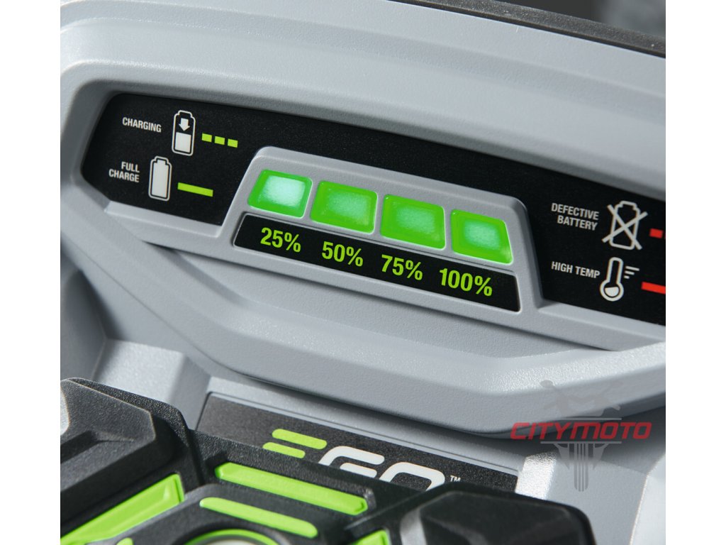 Pro rychlé nabíjení baterií EGO je nutné použít inteligentní rychlonabíječky EGO. Rychlonabíječka je opatřena ložem baterie tak, aby se baterie dostala do nabíječky pouze správným způsobem. Nabíječka je opatřena řídící elektronikou, která naprosto samostatně vyhodnotí stav baterie a automaticky zvolí režim nabíjení, dobu nabíjení a nabíjecí proud. Stav baterie a aktuální stav nabití je indikován LED diodami na panelu. Nabíječka je tak plně automatická bez jakéhokoliv nutného zásahu ze strany uživatele. Ergonomicky je navržena tak, aby byla dostatečně stabilní nebo ji lze zavesit na zeď. Díky účinnému ventilátoru je chlazení baterie efektivnější a umožňuje zahájit nabíjení baterie dříve a dokončit nabíjení rychleji. Výsledkem je, že čas potřebný k nabití baterie je často kratší než pracovní doba plně nabitého stroje. Například od "0" do plného nabití 2,5Ah baterie trvá této nabíječce 30 minut a baterie 5,0Ah 40 minut. Takže při střídání dvou baterií mnohdy pokryjete výkon potřebný pro celodenní práci.