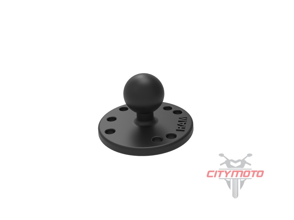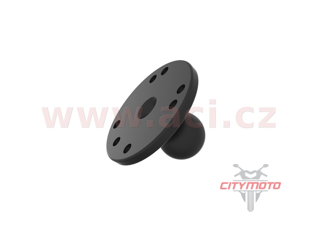 Kruhový adaptér / úchyt na rovné povrchy s kulovým čepem. Adaptér má průměr 6,35 cm a má předvrtaných 7 děr, z toho 4 dle průmyslového vzoru děr AMPS.