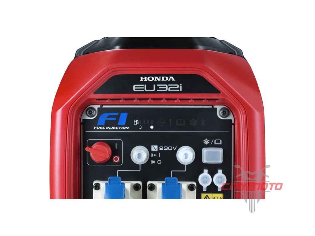 Spojení pomocí Bluetooth s chytrým telefonem umožňuje vzdálené sledování stavu elektrocentrály pomocí aplikace, stejně jako vypnutí motoru. Na mobilním telefonu tak uživatel může sledovat např. zbývající množství paliva, zbývající provozní dobu, poskytovaný výkon, informace o chybách a údržbě a pod. Zcela nový motor GX130 vychází ze zkušeností konstrukce motorů používaných v malých motocyklech Honda. Jedná se o představitele nejmodernějších benzínových motorů, splňujících přísná emisní a hluková opatření. Konstrukce motoru je svým pojetím ojedinělá v oblasti strojů a tvoří naprostou špičku. Jednoválcový motor Honda GX130 s rozvodem OHC je opatřen elektronickým vstřikováním paliva, třícestným katalyzátorem s lambda sondou a použitím zcela nových materiálů je nejlehčím, nejčistším a nejúspornějším ve své kategorii. EU32i bez problémů snáší i benzíny s vyšším podílem ethanolu pod označením E10. Elektrocentrála splňuje veškeré nároky na elektrickou bezpečnost a je opatřena ochrannými prvky jako je např. ochrana motoru proti úniku oleje nebo alternátoru proti přetížení. V případě přetížení elektrocentrály se aktivuje červená výstražná kontrolka přetížení na ovládácím panelu a automaticky dojde k odpojení elektrického výstupu, přičemž motor neustále běží. Stačí odpojit spotřebič, vypnout motor a po několika vteřinách opět motor nastartovat. Dojde k "resetu" řídící jednotky a vše je opět v pořádku. Spotřebič, který elektrocentrálu přetížil už nepoužívejte a použijte spotřebič s příkonem, odpovídajícím výkonu elektrocentrály. Lze však pomocí speciálního kabelu propojit dvě identické elektrocentrály EU32i a zdvojnásobit tak možný napájecí výkon. Konstrukce elektrocentrály je dostatečně robustní a pevná, nekroutí se a spolehlivě tlumí působení vibrací od soustrojí na podklad. Snižuje se tak hlučnost elektrocentrály a práce je potom příjemnější. Údržba elektrocentrály je zcela nenáročná a spočívá v základní údržbě benzínového motoru.