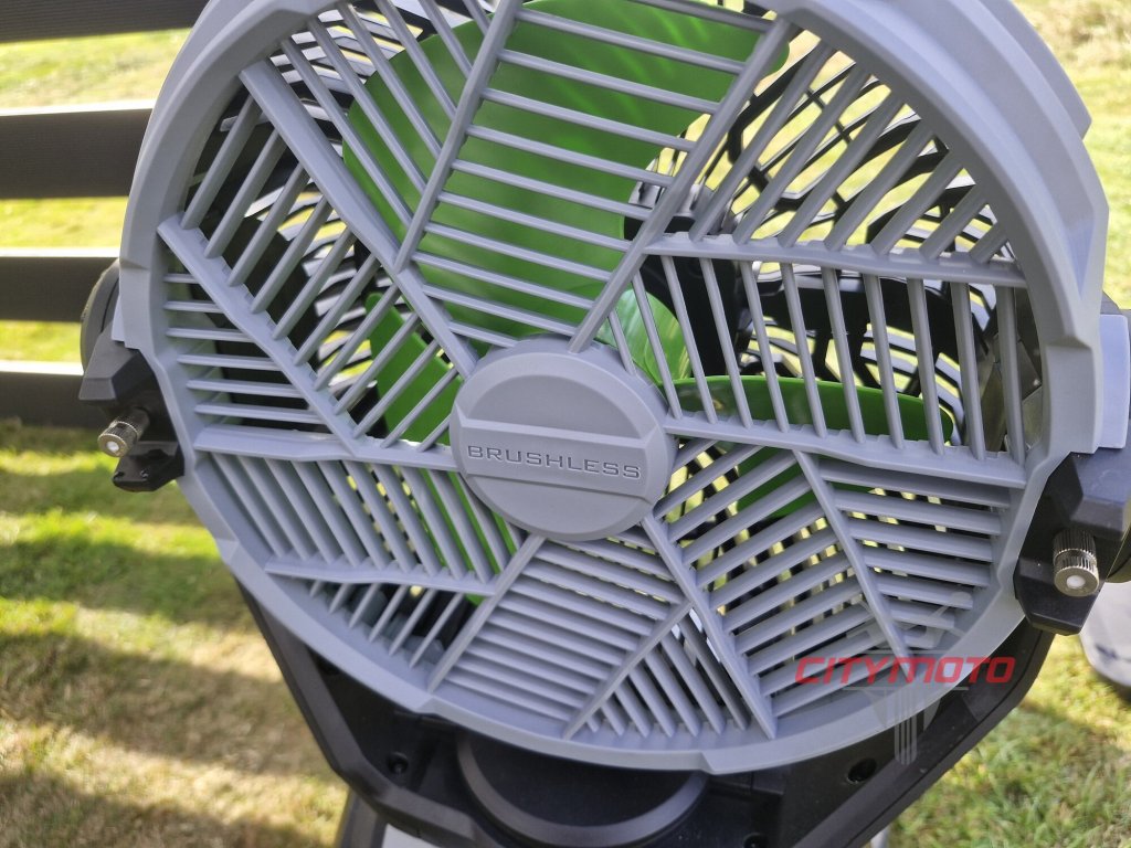 Ventilátor má průměr 25 cm a vzhledem k jeho kompaktní velikosti a hmotnosti 4,6 kg je snadno přenosný. Lze si zvolit rychlost vzduchu z 5-ti možností plus funkce "turbo". Oběžné kolo vantilátoru je otočné ve 2 osách, tzn. jak horizontálně, tak i vertikálně v rozsahu 60°, 120°a 180°. Ve středu ventilátoru se nachází 2 vodní trysky, do kterých v případě nutnosti podává vodu integrované vodní čerpadlo. Vytváří se tak vodní mlhovina, jejíž intenzitu zle řídit kromě rychlosti ventilátoru i třema režimy výkonu vodního čerpadla. Vytvoříte si tak optimální prostředí. Maximální průtok vzduchu ventilátorem je 1.700 m3/hod. při max. rychlosti vzduchu 9 m/s. Jen pro představu, velikost horkovzdušného balónu pro pilota se 4 pasažéry je cca 3.000 m3. To znamená, že tímto ventilátorem byste takový horkovzdušný balón naplnili za necelé 2 hodiny. Slušný výkon na takového drobečka, že? A jak dlouho vydrží baterie? V sadě dodávanou baterií EGO 2,5Ah vydží ventilátor v režimu 1 běžet až 30 hodin nepřetržitě.