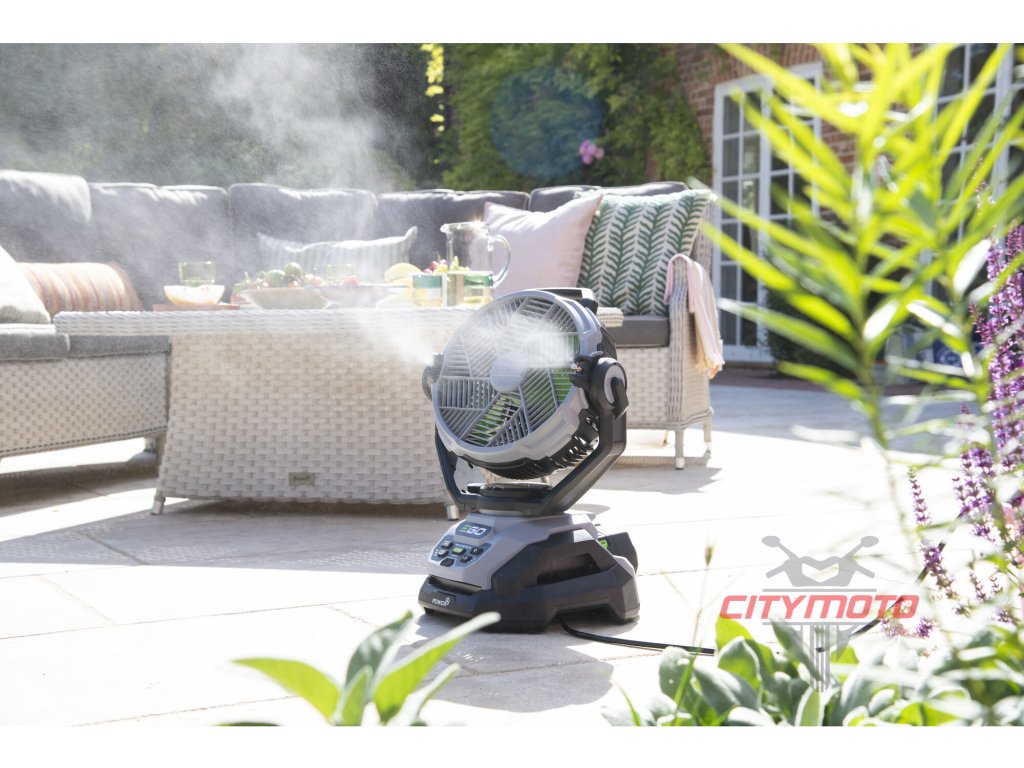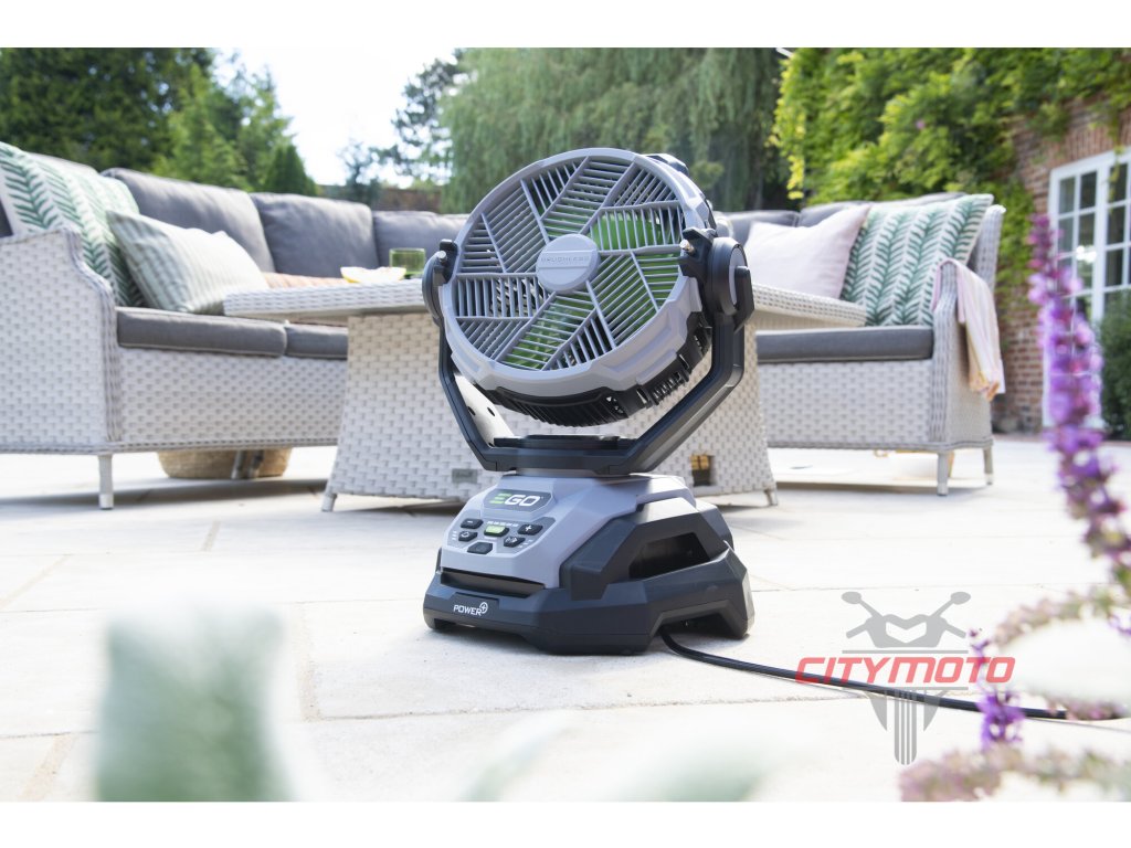 Ventilátor má průměr 25 cm a vzhledem k jeho kompaktní velikosti a hmotnosti 4,6 kg je snadno přenosný. Lze si zvolit rychlost vzduchu z 5-ti možností plus funkce "turbo". Oběžné kolo vantilátoru je otočné ve 2 osách, tzn. jak horizontálně, tak i vertikálně v rozsahu 60°, 120°a 180°. Ve středu ventilátoru se nachází 2 vodní trysky, do kterých v případě nutnosti podává vodu integrované vodní čerpadlo. Vytváří se tak vodní mlhovina, jejíž intenzitu zle řídit kromě rychlosti ventilátoru i třema režimy výkonu vodního čerpadla. Vytvoříte si tak optimální prostředí. Maximální průtok vzduchu ventilátorem je 1.700 m3/hod. při max. rychlosti vzduchu 9 m/s. Jen pro představu, velikost horkovzdušného balónu pro pilota se 4 pasažéry je cca 3.000 m3. To znamená, že tímto ventilátorem byste takový horkovzdušný balón naplnili za necelé 2 hodiny. Slušný výkon na takového drobečka, že? A jak dlouho vydrží baterie? Samozřejmě záleží na kapacitě baterie, ale s baterií EGO 2,5Ah vydží ventilátor v režimu 1 běžet až 30 hodin nepřetržitě.
