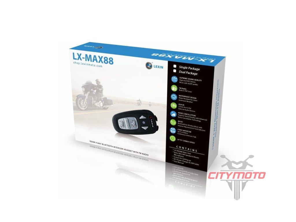 Interkom LX MAX 88 je komunikační zařízení s dosahem až 1500m, které lze použít pro komunikaci mezi jezdcem a spolujezdcem, nebo až se 4 stroji. Díky technologii Bluetooth je možné přijímat hovory z mobilního telefonu, tato funkce lze ještě vylepšit automatickým přijetím hovoru. Dále lze propojit s MP3, GPS navigací nebo jinými audio zařízeními. Komunikátor lze připevnit na jakoukoli integrální, výklopnou nebo otevřenou helmu.