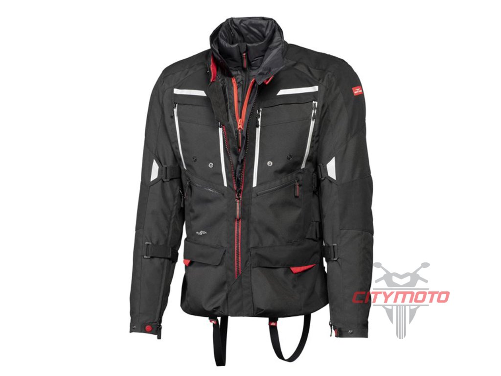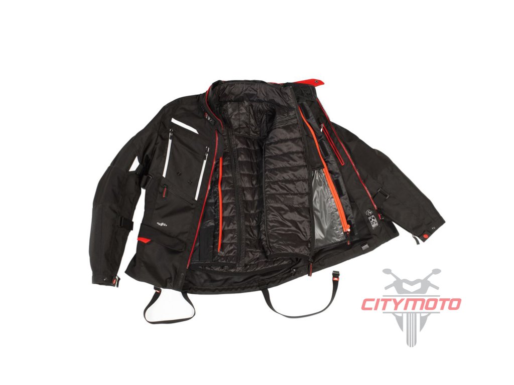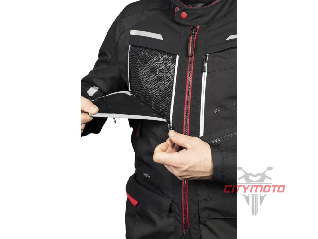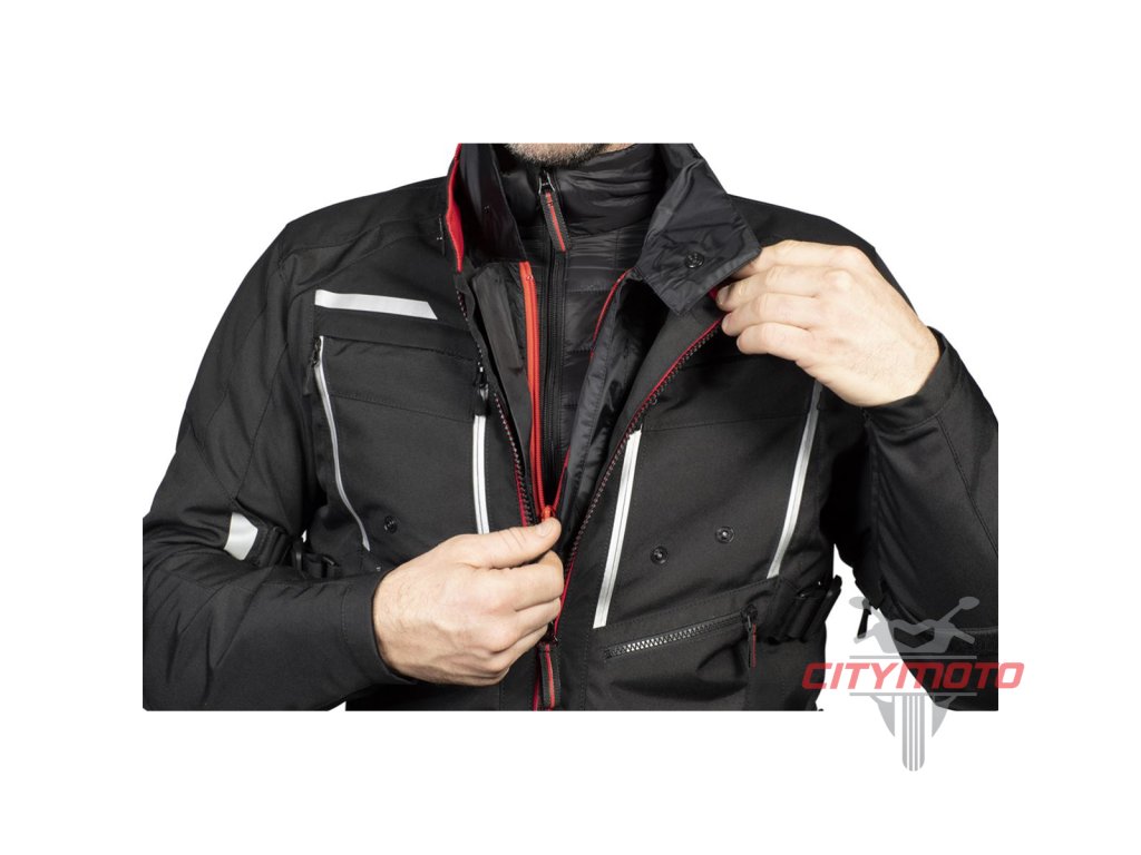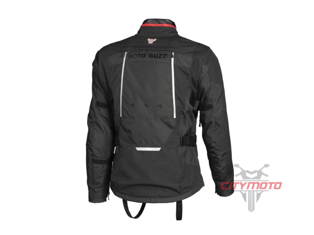 Moto Guzzi Adventure Touring Jacket inspiruje každého. pohodlný střih. Technická tkanina s vysokou odolností. Nastavitelné větrací otvory na hrudi a rukávech (přední vzduchový panel jako +). Odnímatelná tepelná podšívka; WP membrána (+ odnímatelná a použitelná samostatně). Nastavitelné konce pasu a paží, nastavitelný systém límce. Vlastní patentky Moto Guzzi. Certifikovaná norma EN 17092 (schváleno). Obsahuje CE 1621-1 chrániče loktů a ramen. Volitelný CE chránič zad (Lev 1 nebo 2) (+ chránič hrudníku). Kompatibilní s airbagy. 4 vnější kapsy (1 Wp); Podšívka a membránové vnitřní kapsy. Barvy: černo-stříbrná-červená. Odpovídající kalhoty.