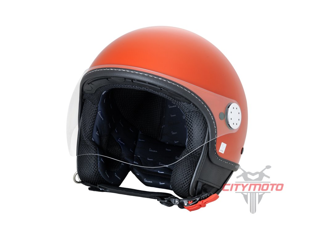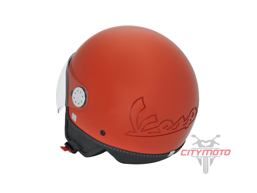 Na zadní straně skořepiny přilby je barevně sladěné vyryté logo Vespa – jemný, ale stylový detail. Mikrometrický uzavírací systém s integrovaným kroužkem proti krádeži nabízí bezpečné držení a vysoký komfort nošení.