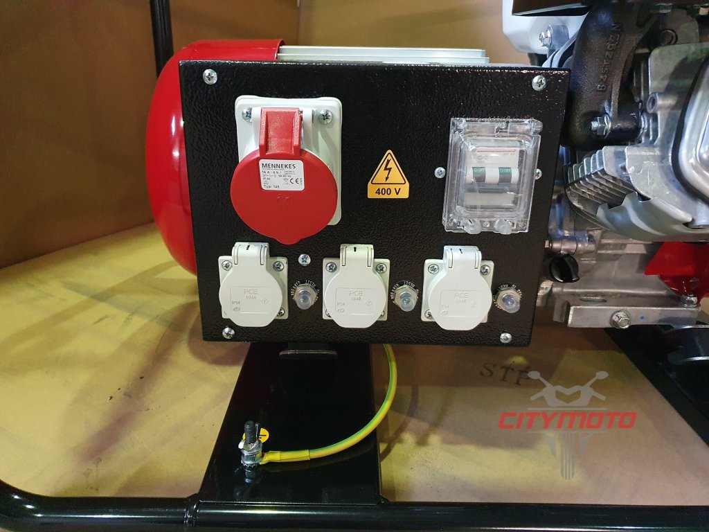 Tato robustní, benzínová třífázová elektrocentrála vysokého krytí IP54 je svým výkonem max. max. 7,0 kVA (3 f.) / 4,0 kVA (1 f.) nejvhodnějším přenosným zdrojem elektrické energie do vlhkých a nehostinných podmínek použití profesionálních hasičů, záchranářů a jiných složek, které potřebují elektrocentrálu odolnou vlhkému a prašnému prostředí. Krytí IP54 znamená, že alternátor není sice prachuvzdorně ochráněn proti částečnému vnikání prachu, ale pouze v míře, která neovlivňuje bezproblémový chod zařízení a stříkající voda při dopadu na stroj pod jakýmkoliv úhlem od svislé osy stroje nemá vliv na chod zařízení. Celá soustava je uložena na pružných silentblocích ve vyztuženém rámu, svařeném z ocelových trubek o průměru 25 mm. Ten zajišťuje mimořádnou ochranu soustavy proti případnému poškození, snadné instalaci do zásahového vozidla a zároveň slouží jako transportní madlo pro snadnou manipulaci. Vzhledem ke své hmotnosti je možné elektrocentrálu za příplatek opatřit transportním kolovým podvozkem nebo hlídačem izolačního stavu. Proto, aby alternátor produkoval napětí 400V / 230V / 50Hz, je motor opatřen automatickým, mechanickým regulátorem otáček tak, aby při jakémkoliv odběru proudy byly otáčky motoru konstantní ve výši 3000 ot./min. Elektrocentrála je opatřena zásuvkami 1x CEE (16A 400V, IP44) a 3x Schuko (16A 230V, IP54). Ovládání elektrocentrály je velice snadné a jednoduché. Stačí natankovat, elektrocentrálu postavit na vodorovnou plochu, zkontrolovat olejovou náplň motoru, nastartovat zatažením za rukojeť ručního startéru, počkat pár vteřin na ustálení chodu motoru a do příslušné zásuvky připojit napájený spotřebič. Elektrocentrála splňuje veškeré nároky na elektrickou bezpečnost a je opatřena ochrannými prvky jako je ochrana motoru proti úniku oleje nebo alternátoru proti přetížení. Robustní a pevná konstrukce rámu se nekroutí a spolehlivě tlumí působení vibrací od motoru na podklad. Snižuje se tak hlučnost elektrocentrály a práce je potom příjemnější. Údržba elektrocentrály je zcela nenáročná a spočívá v základní údržbě benzínového motoru.